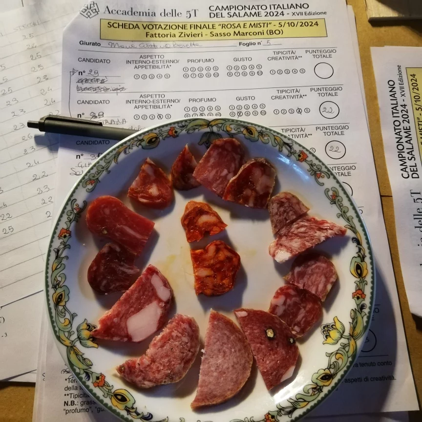 Per il terzo anno le finali si sono svolte a Sasso Marconi, nell’affascinante cornice della Fattoria Zivieri: giurati, candidati e ospiti hanno “lavorato” assaggiando i salami in un ambiente circondato da prati e boschi pur se il clima non ha aiutato come l’anno scorso.Pur se in numero ridotto dovendo lavorare durante il week and a scuole chiuse, gli studenti dell’Istituto alberghiero Luigi Veronelli di Casalecchio sul Reno hanno potuto conoscere e ascoltare gli artigiani che hanno realizzato e raccontato i loro salami non solo buoni ma soprattutto interessanti per le culture territoriali da cui hanno avuto origine fino a essere persino emozionali. Infatti è proprio questo l’obbiettivo del Campionato che vuole essere formativo e didattico, non è solo quello di monitorare i norcini virtuosi, ovvero che, rispettando il benessere animale e i processi fermentativi senza scorciatoie, soddisfano il palato avendo anche cura della salute del cliente e dell’ambiente.